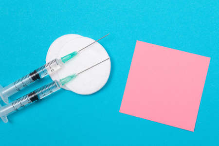 Vaccination, Immunology or Revaccination Concept - Two Medical Disposable Syringe Lying on Blue Table in Doctors Office in a Hospital or Clinic. Blank Pink Sticky Note - Mock Up with Copy Space