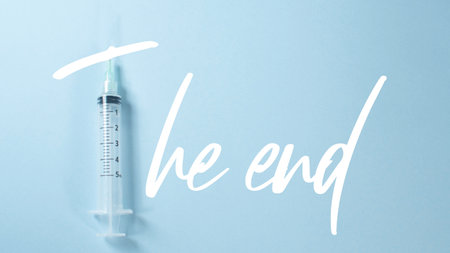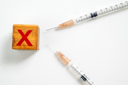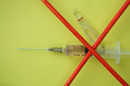 Top view of vaccine refuse concept. Hand stopping vaccine injection. Ativax movement. Side effects fear. Anti immunisation campaing