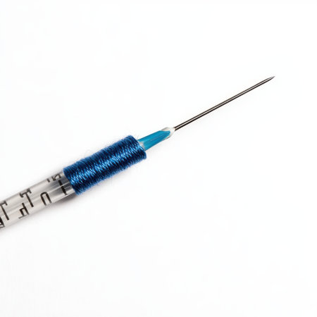 Sharp needle with blue grip and transparent body on a white background, used for sewing, crafting, and various textile applications for precision work.