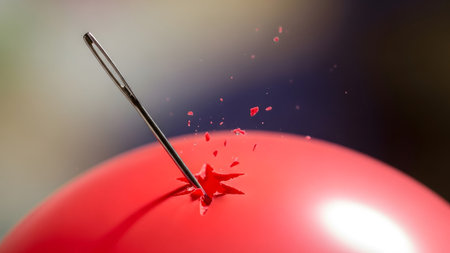 A sewing needle penetrates a red balloon, causing it to burst with fragments flying outwards.