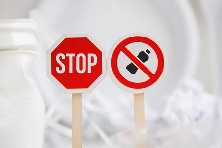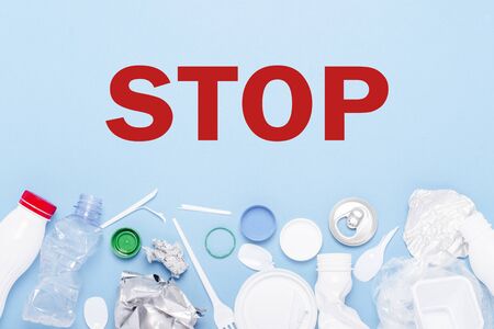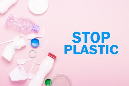 STOP Plastic Pollution sign against the background of plastic trash. environmental concept
