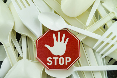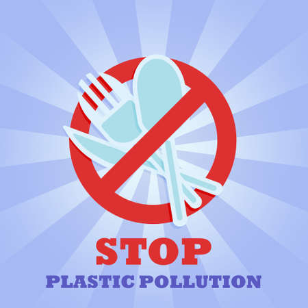 Plastic spoon knife and fork. Prohibition sign. No symbol. Banner. Stop plastic pollution.
