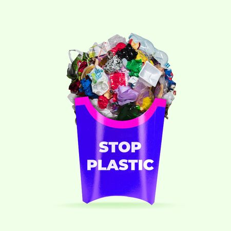 Concept of ecology disaster, environmental pollution, garbage. Stop plastic. Negative space to insert your text or ad. Modern design. Contemporary colorful and bright art collage. Unusual look.