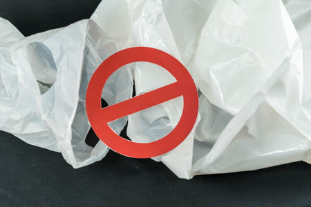 sustainable living conceptual still-life, Reduce plastic use message on top of a bunch of plastic bags
