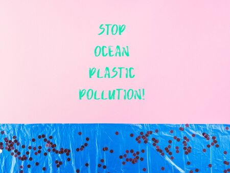 Blue plastic trash bag as sea water surface with confetti as air bubbles on pink background. Ocean plastic pollution text concept