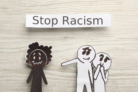 Flat lay composition with phrase Stop Racism and paper figures on white wooden table