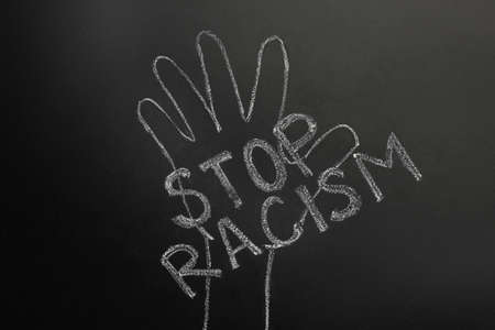 Chalked inscription Stop Racism and raised hand on blackboard