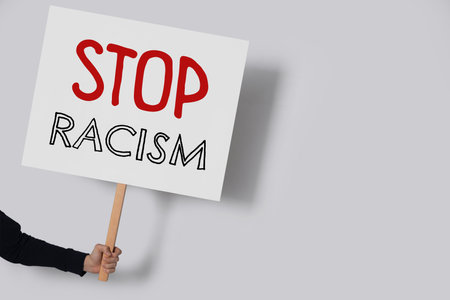 Young teen girl holds poster with word Racism. Stop discrimination and ethnic inequality. Angry activist protest. Observance right