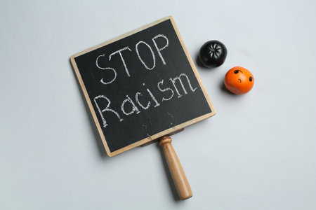 Chalkboard with phrase Stop Racism and human figure on light grey background, top view