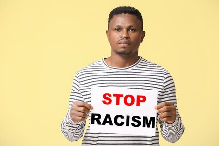 Sad African-American man with poster on white background. stop racism