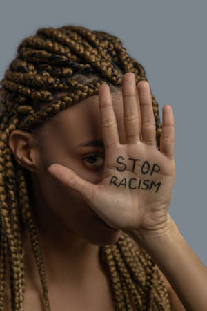 Stop racism. Young African American woman covering her one eye with palm with stop racism lettering