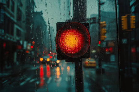 red traffic light in the rain, with droplets running down the lens, created with generative ai