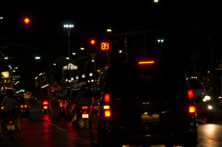 Blurred image rear sie view of cars on the road with turn on brake light at night. Environment of car at night with guard lens on the road.