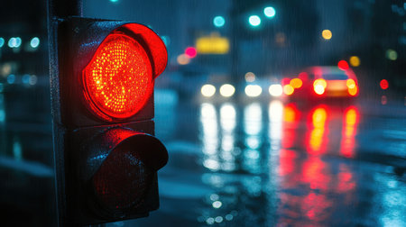 A close-up of a red traffic light glowing at a city intersection during a rainy night. -