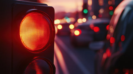 A vivid red traffic light shines on a busy city street as cars come to a halt in the fading evening light.