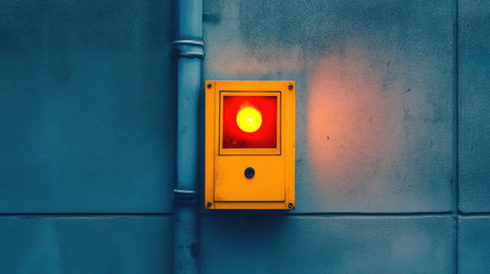 A striking red alarm signal box is mounted on a textured urban wall, evoking themes of safety and alertness in a contemporary setting filled with industrial charm.
