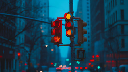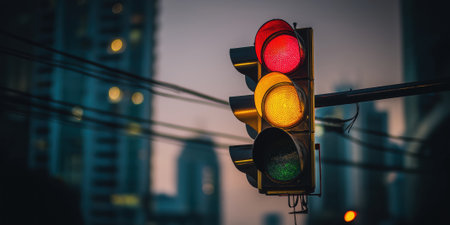 A vibrant urban traffic signal displaying red, yellow, and green lights against a dusky city backdrop. The scene captures the essence of city life and traffic management.