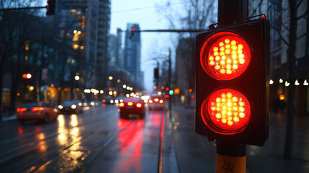 A close-up view of a traffic light displaying a red signal, with bright colors against a blurred cityscape background, emphasizing its importance in road safety