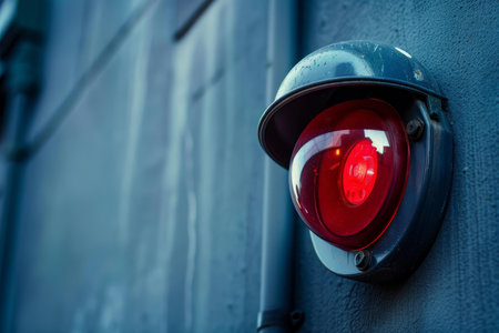 Red warning light mounted on blue industrial building