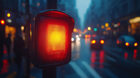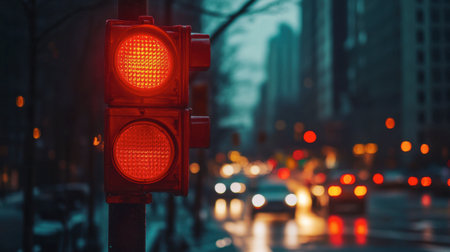 A vibrant red traffic light shines in an urban environment during dusk. Soft reflections from vehicles and buildings create a dynamic city atmosphere.