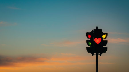 A whimsical traffic light shaped like hearts glows in red, yellow, and green as a vibrant sunset paints the sky.