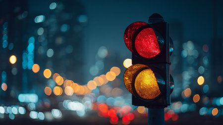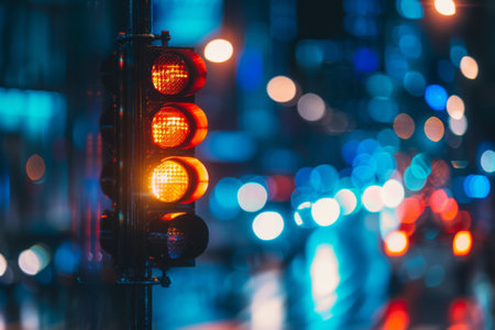 A vibrant traffic signal stands prominently in an urban street, surrounded by glowing bokeh lights and blurred vehicles, capturing the essence of city life.