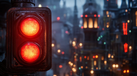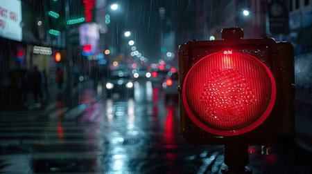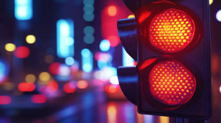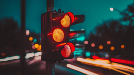 A striking image of a red traffic light at night, surrounded by blurred city lights. The illumination creates a captivating atmosphere, emphasizing urban life and safety.