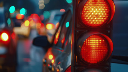 Close-up of a red traffic light signaling a halt to the flow of vehicles, contributing to congestion