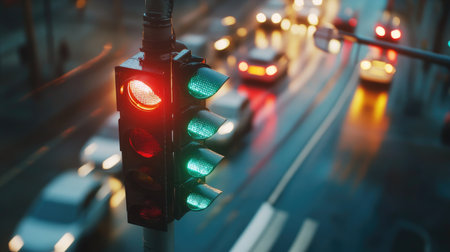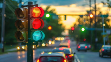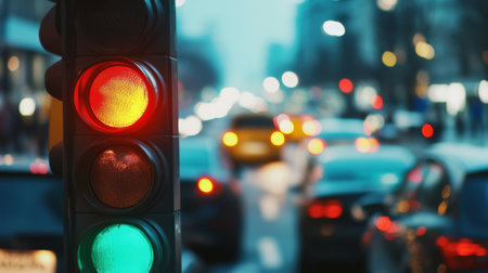 A close-up of a traffic light changing colors with cars waiting at a red light, highlighting the role of traffic signals in managing road flow.