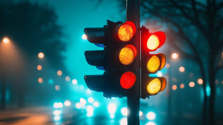 A captivating night scene showcases red traffic lights shrouded in fog. The atmospheric setting evokes a sense of mystery and tranquility on an empty street.