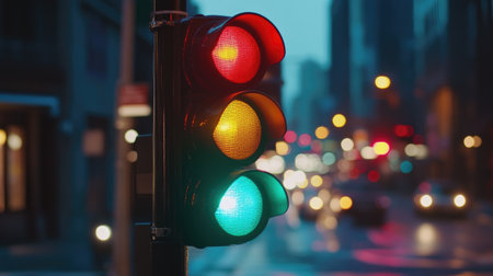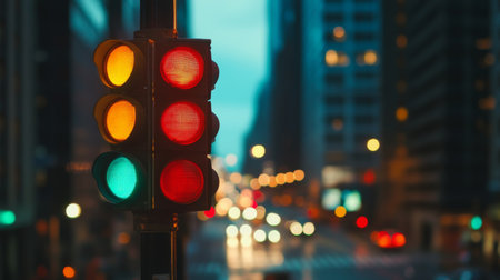A close-up of a modern traffic light against the backdrop of a bustling metropolis at dusk. The traffic light is illuminated with vibrant red, yellow, and green lights.