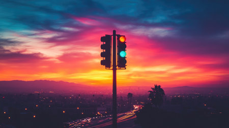 A dramatic shot of a traffic light silhouetted against a colorful sunset, emphasizing the transition from day to night in a vibrant cityscape