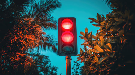 A vibrant red traffic light stands prominently against lush greenery, highlighting the intersection of urban infrastructure and natural beauty.