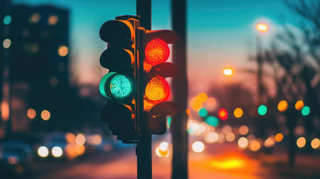 A vibrant traffic signal glows in green and red during dusk, casting colorful lights against a blurred urban backdrop filled with bokeh effects.