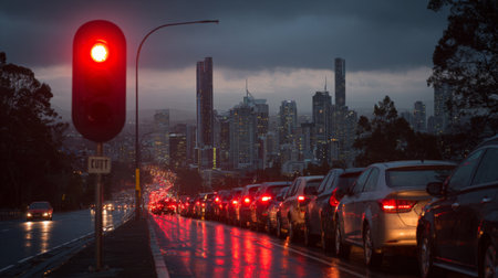 This image captures a bustling city scene during dusk, showcasing a line of cars halted at a red traffic signal. The urban skyline glimmers in the rain.