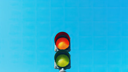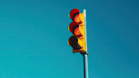 A close-up view presents a traffic signal featuring illuminated red, yellow, and green lights. The composition is set against a clear, azure sky, enhancing the vibrant colors of the signal. The image has a vintage aesthetic and could be used for illustrations related to traffic or transportation.