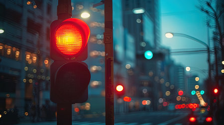 The spectrum of colors from a glowing traffic light stands out against the blurred cityscape, painting a mesmerizing scene of urban ambiance. This picture captures the intersection of technology and urban living. illustration created by Generative AI