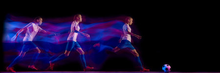 Female football player striking ball in sequence with pink and cyan motion streaks. Concept of sport advertising visuals, body in motion, fitness campaigns, and athletic branding content. Banner