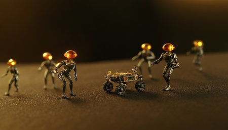 Astronauts with Mars rover on dark background
