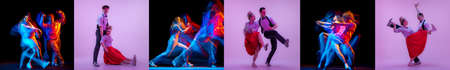 Set with images of stylish men and women dancing in bright clothes on colorful background at dance hall in neon light. Art, danc, hip-hop, retro, vintage style and fashion