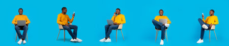 Collage with middle aged black man using different gadgets sitting on chair, blue background, panorama