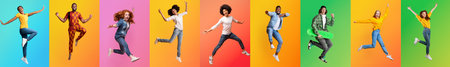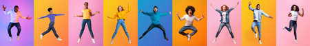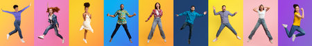 Diverse group of people joyfully jumping against vibrant colored backgrounds