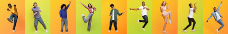 Diverse group of people joyfully posing in a colorful collage set