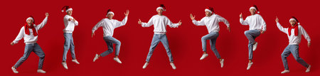 Joyful Man in Christmas Outfit Jumping Against Bright Red Background