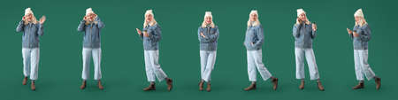 Beautiful mature woman in winter clothes on color background