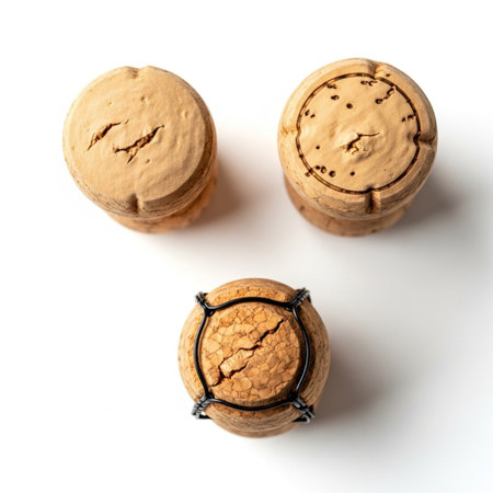 Close-up of champagne corks and wire cages on dark surface, celebration and wine accessories concept