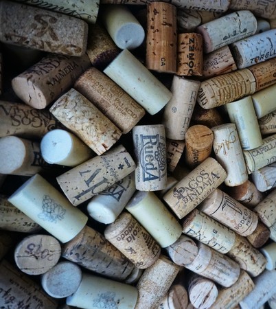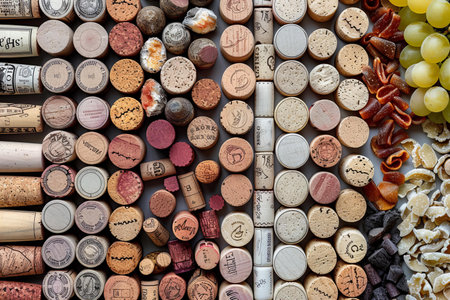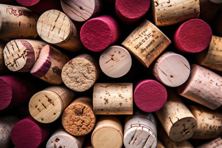 Wine corks in natural, pink and deep red tones create a textured, rustic background evoking wine culture, celebration, recycling and vintage charm