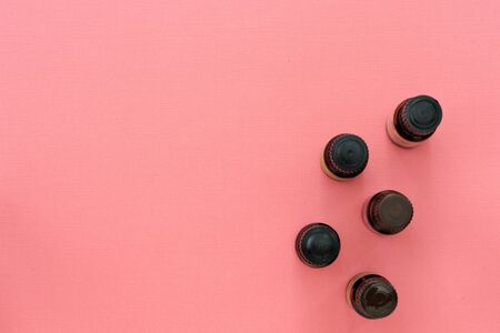 Set of essential oils on a pink background, top view. Aromatherapy and Spa treatments, bathing, relaxation
