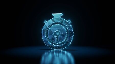 3d rendering wireframe digital techno neon glowing symbol of circular chronometer with shining dots on black background with blured reflection on floor