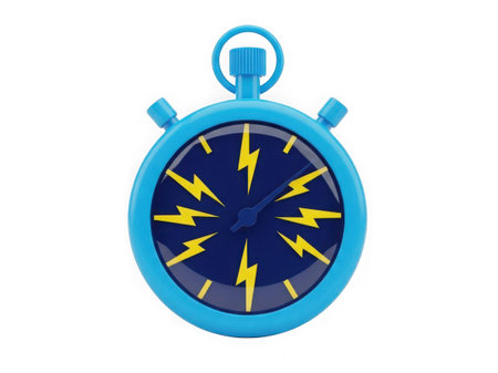 This image features a blue stopwatch with a unique lightning bolt design on its face. The stopwatch has a circular shape with a blue body and yellow lightning bolts as hour markers. It includes two buttons on either side and a small loop at the top for attachment. The overall design is playful and modern, making it a distinctive timekeeping device.